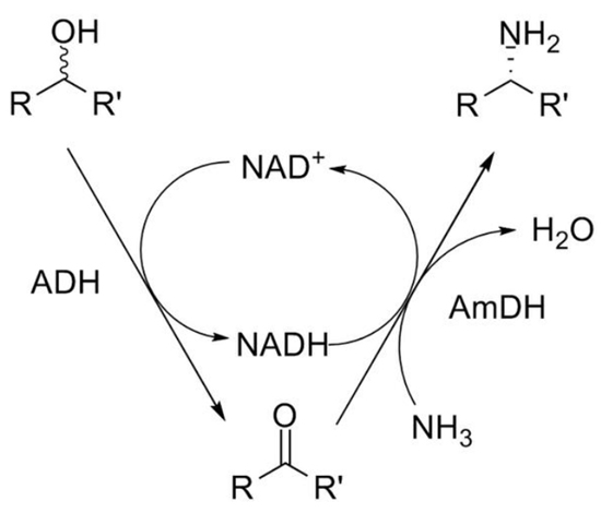 生产手性氨的新氧化还原酶 尼古拉斯·特纳教授和他的同事,上个月在《Science》上发表了他们最新的研究结果,是一种醇脱氢酶(ADH)和氨脱氢酶的组合,用于将消旋醇转化为手性氨。此反应在将醇转换成酮的过程中生成一个NADH,而在后续的还原胺化反应中NADH重新变成NAD+。 ...