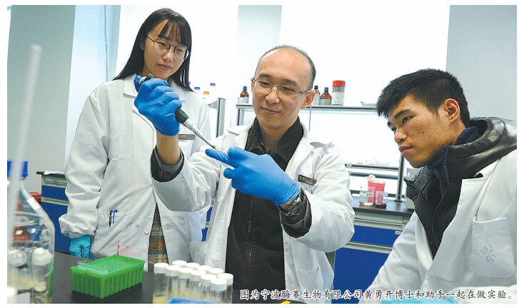 “7O后”博士黄勇开和团队成员共同创建的宁波酶赛生物工程有限公司落户于东郊街道。在他们的助推下,宁波新的酶催化工艺已经“发酵”。